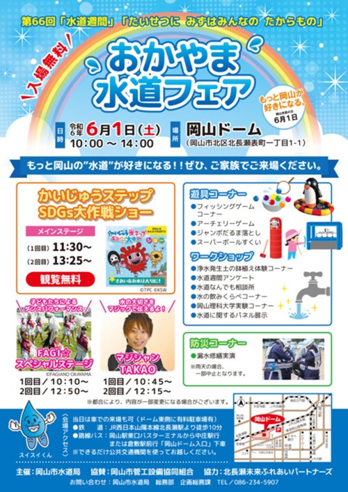 第66回水道週間のメイン行事として、「おかやま水道フェア」を開催します。もっと岡山の“水道”が好きになるイベントですので、ぜひ、ご家族でご来場ください。