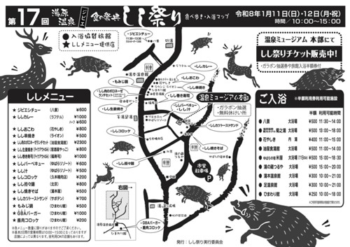 温泉街を歩きながら様々なしし料理を食べ比べ、