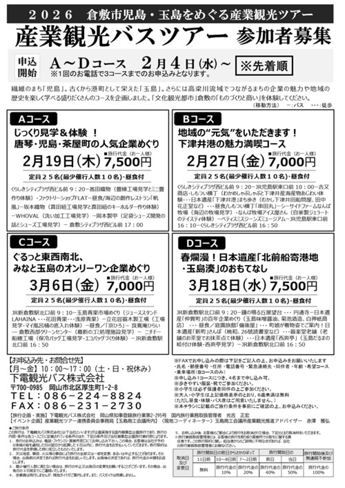 Aコース「じっくり見学&体験!唐琴・児島・茶屋町の人気企業めぐり」:2/19(木)