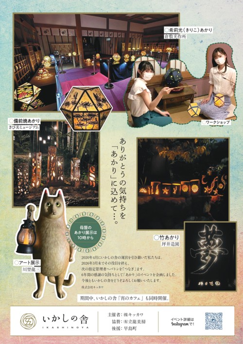 いかしの舎にて、4組のアーティストが幻想的に彩るイベント「アカリツナギ」が開催されます。