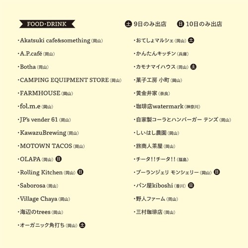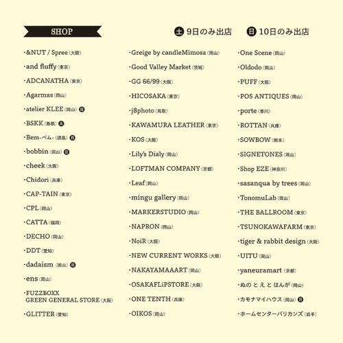 Agarmas(岡山)、atelier KLEE(岡山)※日曜のみ、BSKK(島根)土