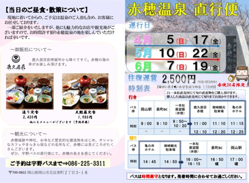 各日 1便 9時発(岡山駅)~帰17時(岡山駅)