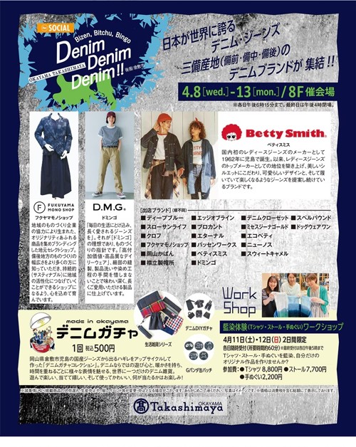 日時:2026年 4月8日(水)~13日(月) 10時~18時15分 最終日は16時まで場所:岡山高島屋 8階 催会場 岡山市北区本町6番40号 086-232-1111参加費:実費内容・日本が世界に誇るデニム・ジーンズ三備産地 (備前・備中・備後)のデニムブランドが 集結!!
