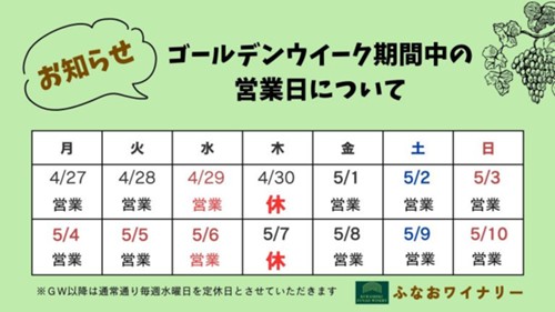 ふなおワイナリー、美観地区の直営店ともに営業日が変更します。