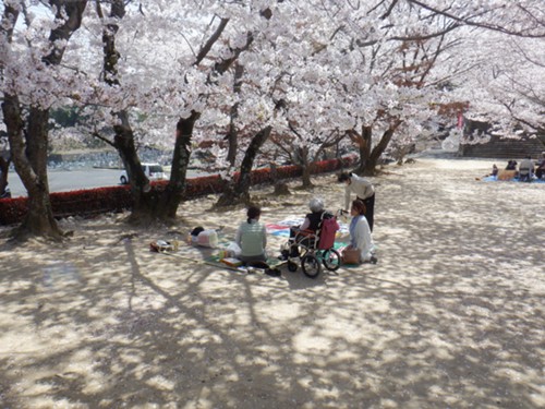 桜咲く木の下で、たけのこご飯のお弁当を食べ