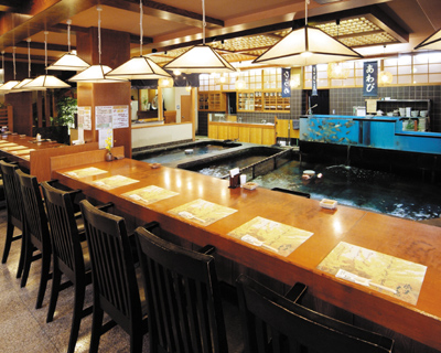 大きないけすをのぞむ1階のカウンター 目の前の大きないけすには瀬戸内・日本海から魚が届けられます。
