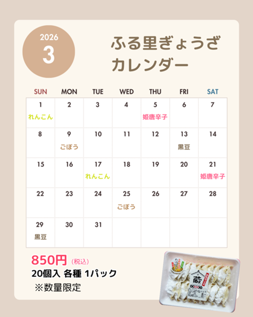 大人気ふるさとぎょうざの3月のスケジュールです。
