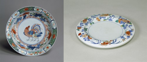 写真左:色絵鶏文平鉢(いろえにわとりもんひらばち)