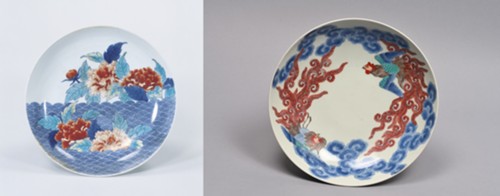 写真左:色絵牡丹青海波文皿(いろえぼたんせいかいはもんさら)