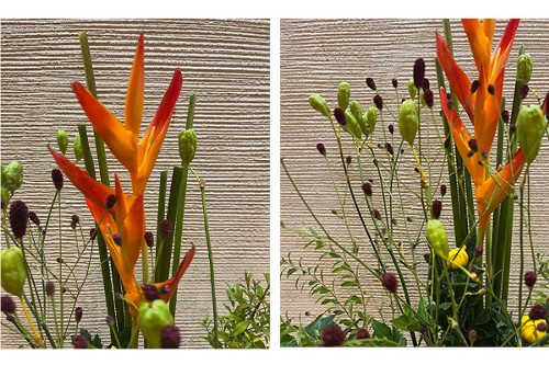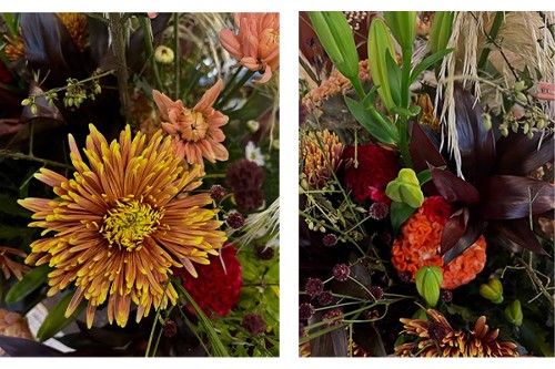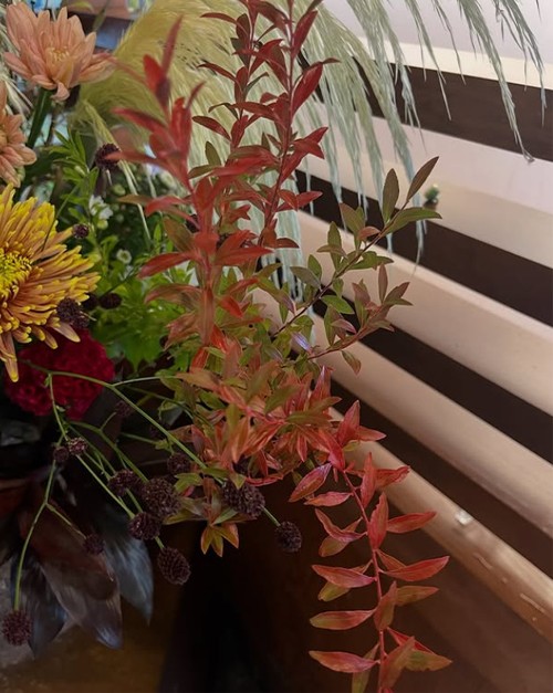 スプレーマム、菊、キングヘレコニア、ワレモコウ、日扇の実、紅葉雪柳、木苺