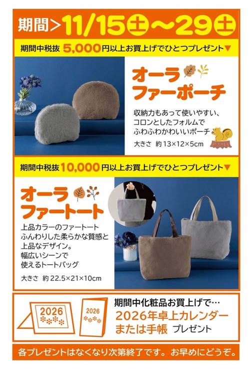期間中化粧品お買上げでプレゼント◆税抜5,000円以上→オーラファーポーチ ◆税抜10,000円以上→オーラファートート ◆また化粧品お買上げで→2026年卓上カレンダーまたは手帳プレゼント