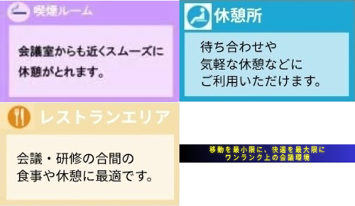 同フロアに喫煙ルームもあり、長時間の会議や研修でもリフレッシュできます。