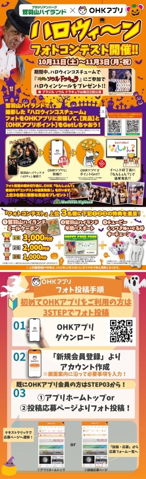 鷲羽山ハイランドで撮影した 『ハロウィンコスチューム』フォトをOHKアプリに投稿して、[賞品]と[OHKアプリポイント]をGetしちゃおう!